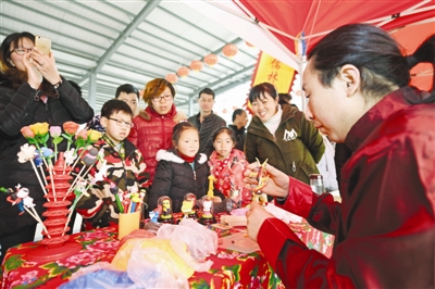 2月25日,滁州花博园内,市民在观看省级非物质文化遗产“庐州面塑”传承人武建付现场制作面塑作品。