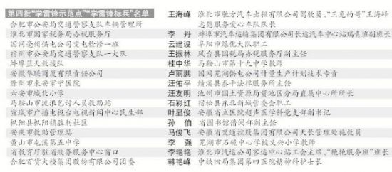 新安晚报 安徽网 大皖客户端讯 2017 年以来,全省各地各部门广泛开展学雷锋活动,组织干部群众立足本职、爱岗敬业、奉献社会,自觉践行雷锋精神,涌现出一批学雷锋活动开展得好的基层先进单位和岗位学雷锋先进个人。日前,省委宣传部向社会公布了第四批15 个安徽省学雷锋活动示范点和15 名安徽省岗位学雷锋标兵。