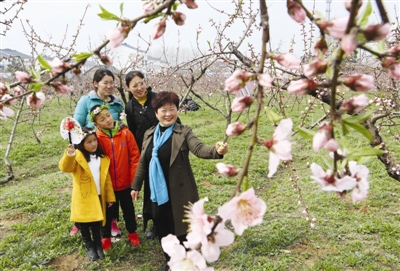 八方游客在仰山村千亩桃园里观赏桃花、享受田园风光。记者李晓村摄