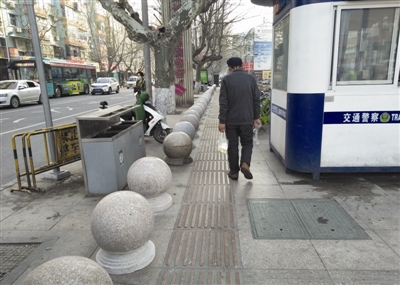 昨天上午,记者来到现场,看到水石广场盲道一侧全部摆上了石球,石球与石球之间只留下了几十公分的空隙。广场东、西两个出口同样也被摆放了石球。记者现场看到,一位市民经过此处时只能靠在盲道边行走。此外,该处广场设有公共自行车停放点,同时还划有非机动车停车位。然而,这些石球却成了“拦路虎”,影响了市民骑车、停车。