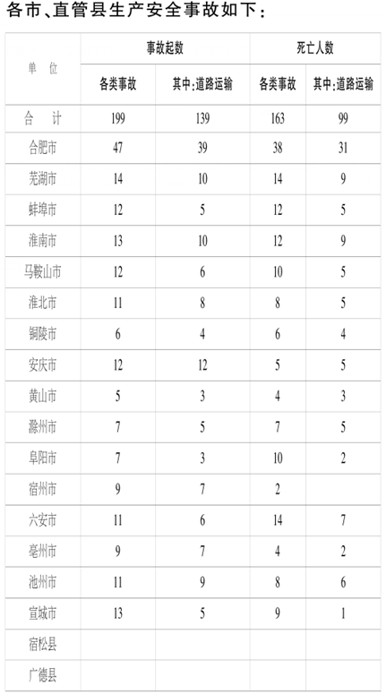 安徽1-2月份安全生产形势 发生事故199起死亡163人 2018-04-01 08:43 扫描到手持设备 字号: 2018年1-2月份,全省发生生产安全事故199起,死亡163人。其中:发生道路运输事故139起,死亡99人。 1-2月份全省发生5起较大生产安全事故,其中:道路运输事故2起,建筑施工事故1起,工商贸其他事故2起。 相关阅读 关键词: 安全事故 事故 运输 12306对高铁宠物运输开展问卷调查2024-05-11 滁宁交通执法联合开展道路运输集中整治2024-05-09 全力维护道路交通安全形势稳定向好2024-04-12 中国学者发现第六大植物激素运输“秘密通道”2024-03-22 我市全力营造安全畅通道路交通环境2024-03-22 温暖相伴40天,今年春运平安落幕2024-03-07 我市落实落细春运安全防控措施2024-03-01 我市切实提升群众春运出行体验感2024-02-28 市交管部门强化春运源头隐患排查整治2024-02-09 春运大幕 今日开启2024-01-26 责任编辑:张友奎 复制网址 打印 收藏 关于我们 | 联系我们 | 加入我们 | 版权声明 | 手机访问 | 网站地图 | 留言反馈 | 我要投稿 中共滁州市委宣传部主办 滁州日报社承办 Copyright?2009-2010 Chuzhou.cn. All Rights Reserved 滁州日报社 版权所有 皖网宣备3412015001号 皖ICP备11004325号-1 热线电话:0550-3022685