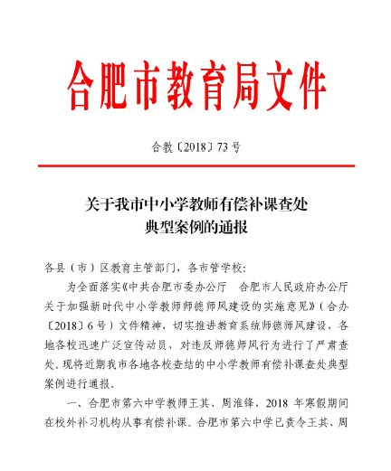 被通报的中小学教师有偿补课查处典型案例共有三例。一是合肥市第六中学教师王其、周淮锋2018年寒假期间在校外补习机构从事有偿补课。合肥市第六中学已责令王其、周淮锋退费,并给予王其、周淮锋警告处分。