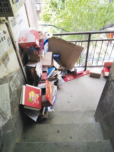 滁城凤凰一村一楼梯口处被人堆上了废旧纸箱,既阻碍通行又构成火灾安全隐患。