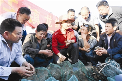 4月19日,在连江镇龙虾产业现场推进会上,来自南京农业大学的水产专家于汝林向当地贫困户讲解小龙虾养殖技术要领。
