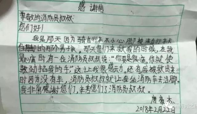 令消防员战士暖心的是,两天以后,小男孩在爸爸的带领下,送去了一封感谢信。