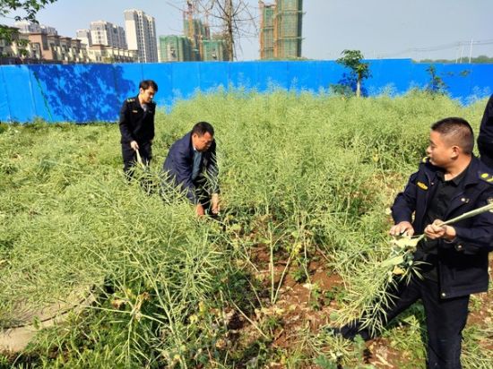 4月25日上午,南谯区城管执法局乌衣大队会同乌衣镇及菊香苑社区工作人员对区政务中心双迎路西侧占用绿地违规种菜现象进行集中清理。