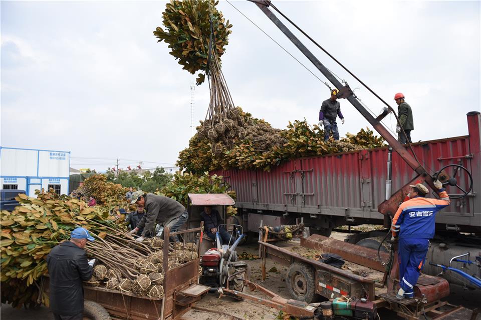 近日,记者来到安徽省滁州市南谯区乌衣镇吴港苗木交易市场,远远就望见来自全国各地的大货车正在排队等候装车。市场许多工人正将雪松、广玉兰等苗木逐一清点、打捆、吊装,忙碌而有序。“现在合作社每天至少对外运送苗木3万棵。”当地的青绿苗木专业合作社负责人赵国兵告诉记者。