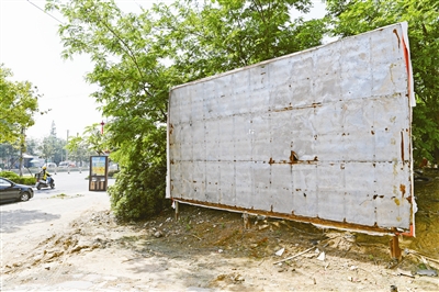 一块大型户外广告牌只剩锈迹斑斑的铁皮,有碍观瞻。