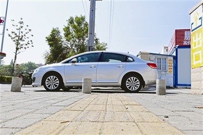 一处二手车交易市场,将售卖车辆停在人行道上。