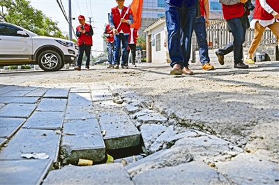 中都大道(湖心路至会峰路段)西侧,人行道多处破损,坑坑洼洼。