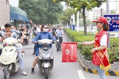5月18日,市公安交管、交通运管部门组织市直近20家驾校的学员进行文明交通志愿服务,并协助进行交通文明、交通安全、交通法规知识等内容的宣传教育活动。此次活动时间为5月18日至6月底。图为驾校学员在滁城天长路和南谯路交叉路口开展文明交通志愿服务活动。