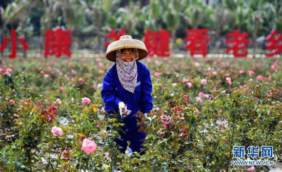 海南三亚亚龙湾玫瑰“斗笠大姐”李玉梅在园区内修剪玫瑰(2018年3月6日摄)。 新华社记者 郭程 摄