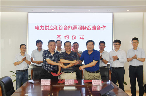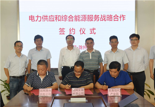 2018年6月14日下午,安徽省滁州市苏滁现代产业园管委会与国网安徽电力有限公司综合能源服务有限公司、国网滁州供电公司隆重举行《电力供应和综合能源服务战略合作协议》签约仪式。协议的签署标志着安徽省首个园区综合能源服务试点区落户滁州苏滁现代产业园,三方在电力供应和综合能源方面全方位合作的也正式启动。