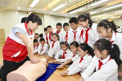 6月19日,南谯区红十字会的志愿者教孩子们学习心肺复苏技能。当日,南谯区团委等单位在湖心路小学开展交通安全和防溺水教育进校园活动。志愿者们利用多媒体课件、图片、案例等形式,教育孩子们如何预防溺水以及溺水救护方法等安全知识。