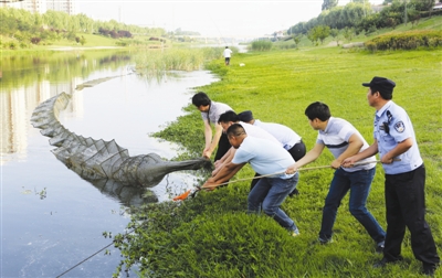 来安县自全面推行河长制以来,截至目前,共设立县级“河长”13名,乡镇级“河长”215名,村级“河长”455名,并创新设置“民间河长”,实时跟踪河长履职情况。今年,该县组织招募“民间河长”323名,参与河湖的管理保护工作。图为来河新安段“民间河长”和驻地民警正在清理非法布网捕鱼。