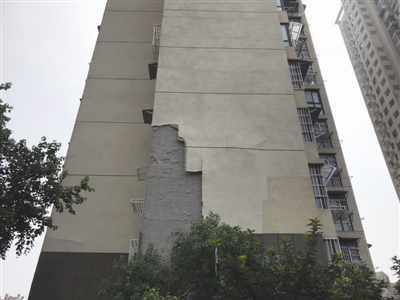 记者走近发现,从18号楼上脱落的“墙皮”散了一地,甚至还有一长溜倒挂在楼下一棵绿化树上,看着叫人揪心。一居民告诉记者,这是前几天大风大雨时脱落的,以前也脱落并修补过,“‘墙皮’大面积反复脱落,小区里每天这么多人进出,安全隐患非常大。”在采访中,该小区多数居民均对房屋质量表示质疑和担忧,并盼望高层脱落“墙皮”能够得到及时维修,让大家放心居住。