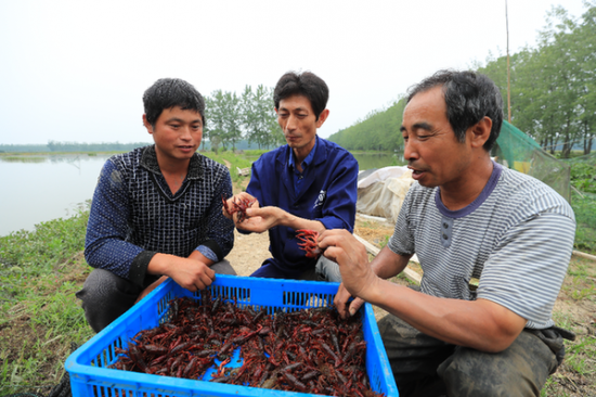 全椒县赤镇龙虾经济专业合作社负责人王如峰(中)在向贫困户传授龙虾养殖技术 沈果 摄