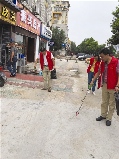 志愿者们穿着红马甲,带上垃圾镊、扫帚、垃圾袋等工具,在沿路街道拾捡烟头,寻找绿化带中的废纸、塑料袋、饮料瓶等垃圾,努力营造干净卫生的环境。在拾捡烟头垃圾的同时,志愿者对沿街商铺开展巡查。志愿者发现,一些沿街饭店门口路面比较脏,有明显的垃圾和污水,部分商铺门口车辆乱停乱放,志愿者立即劝告店家予以整改。