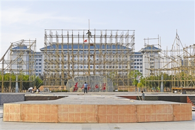 9月11日,第七届中国农民歌会主舞台正在紧张搭建中。 记者计成军摄