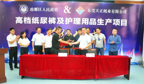 9月10日下午,总投资10亿元的东莞天正纸业高档纸尿裤及护理用品生产项目签约仪式在琅琊新区圆满举行。区委书记余成林,区委副书记、区长周冬梅,区委常委、常务副区长马晓光,琅琊经济开发区管委会主任李继斌,区发改委、区经信委、区招商局等单位负责人出席了签约仪式。签约仪式上,李继斌代表琅琊区人民政府与东莞市天正纸业有限公司总经理吴柱威签订了项目协议,区委副书记、区长周冬梅进行了致辞。