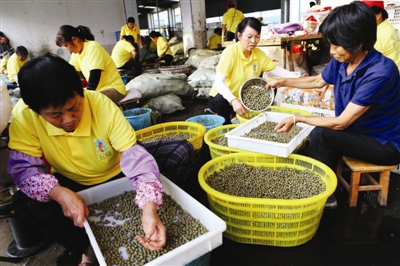 9月22日,在天长市铜城镇龙岗芡实大市场,当地农民工在生产、加工芡实果。近年来,该村充分利用当地水面资源丰富、湖滩洼地众多、群众有传统种植习惯的优势,构建“合作社+公司+基地+农户+互联网”的新型产业化发展模式,小小芡实逐步变成了特色产业。