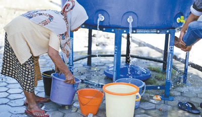 日前,在印度尼西亚中苏拉威西省帕卢,一名妇女在一处安置点接水。 新华社发