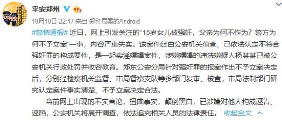 10月10日晚间,郑州公安官方微博发布了情况通报回应。通报称,近日,网上引发关注的“15岁女儿被强奸,父亲为何不作为?警方为何不予立案”一事,内容严重失实。该案件经由公安机关侦查,已依法认定不符合强奸罪的构成要件,是一起卖淫嫖娼案件,涉嫌嫖娼的违法嫌疑人杨某某已被公安机关行政处罚并收容教育。郑东公安分局针对强奸罪的报案作出不予立案决定后,分别经检察机关监督、市局督察支队等多部门复审、核查,市局法制部门研究认定案件事实清楚、不予立案决定合法。