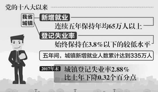 党的十八大以来,我省城镇新增就业再上新台阶,连续五年保持年均65万人以上,城镇登记失业率始终保持在3.8%以下的较低水平。五年间,城镇新增就业人数累计达到335万人。 2017年年末,我省城镇登记失业率2.88%,比上年下降0.32个百分点。今年1月至7月,全省城镇新增就业44.7万人,同比增长10.5%;二季度末,全省城镇登记失业率为2.84%,同比下降0.33个百分点,为2010年以来的最低值。