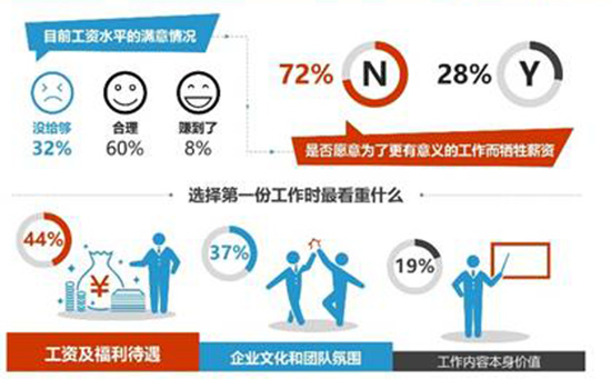 年轻人在选择第一份工作时最看重什么因素?调查显示,44%的年轻人最看重薪资水平,其次是企业文化,约占37%,而工作内容本身排最后,仅占19%。当被问到“是否愿意接受一份薪资水平较低,但工作本身很有意义的工作”时,超过七成的年轻人给出了否定答案,他们认为薪资水平是衡量自身价值的重要标准,工作内容再有意义也不行。