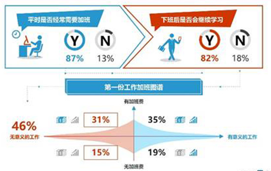 报告显示,在第一份工作中,近九成的年轻人都在加班,只有13%的人拒绝加班。46%的加班在年轻人看来没有意义,另有超过1/3的加班是在不提供加班费情况下的主动行为。