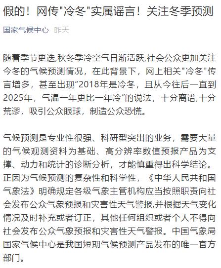 10月16日,国家气候中心微信公众号刊发了《假的!网传"冷冬"实属谣言!关注冬季预测》的文章,文中对网上“2018年是冷冬”等说法回应称“十分离谱,十分荒谬,吸引公众眼球,制造公众恐慌”。