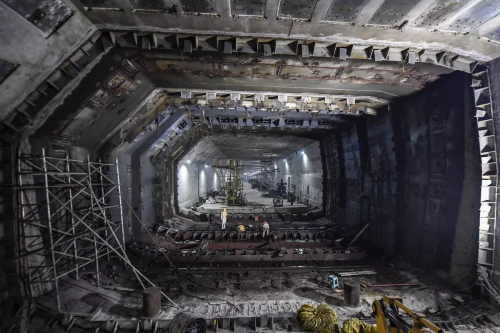 2017年7月7日,港珠澳大桥海底隧道正式贯通。图为施工人员在港珠澳大桥海底隧道最终接头处施工。