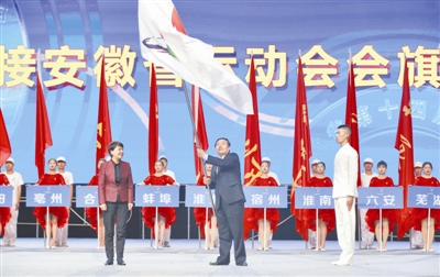 交接仪式前,会场响起激昂的省十四届运动会会歌,省运会会旗缓缓降下。随后,王翠凤、许继伟、王诚共同走到会场交接区域。王诚代表本届运动会的承办方,将省运会会旗交还给王翠凤,许继伟从王翠凤手中庄严地接过会旗,奋力挥舞旗帜,宣示着省十五运正式进入“滁州时间”。
