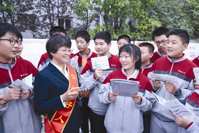 10月19日,南谯区在滁州六中举办“弘扬道德力量 共创文明校园”——道德模范和身边好人进校园活动,进一步弘扬道德模范和身边好人的高尚精神,激励广大学子崇德向善、见贤思齐。图为“安徽好人”孟雪玲老师为学生们宣讲《滁州市民文明手册》。 特约摄影董 超 通讯员李星星摄