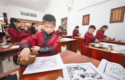 10月28日上午,2018首届滁州南谯非遗文化旅游节暨乌衣非遗小镇开园典礼举行。据悉,乌衣非遗小镇是集生态观光、地域文化、非遗文化于一体的研学旅行基地,入驻非遗文化项目50多个,重点打造了“皮影艺术体验馆”“陶艺体验中心”等九大研学体验馆。目前,已有20多个场馆开馆。10月28日至11月3日开园期间,市民可免费参观。图为小朋友们在体验活字印刷术。李 慧/文 卢志永/图