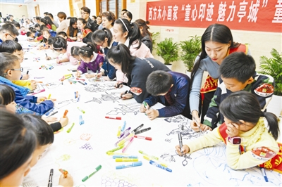 10月28日,滁州美术馆内,小朋友们用手中的画笔描绘心目中的美丽家园。当日,由市文联、市美术家协会共同主办的“童心印迹 魅力亭城”——滁州市首届传统文化新视觉儿童艺术展暨全国少儿美术邀请展在美术馆开幕。开幕式上,数十名儿童围绕“文明新家园”进行主题作画。 记者计成军摄