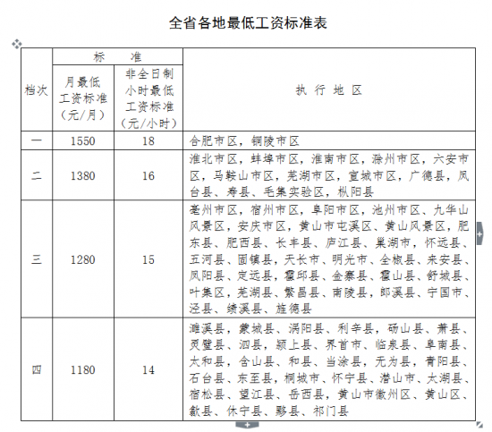 人民网合肥11月1日电(赵越)今日,人民网安徽频道记者从安徽省人社厅了解到,经安徽省人民政府同意,安徽自2018年11月1日起调整全省最低工资标准。调整后,月最低工资标准四个档次分别调整至:1550元、1380元、1280元、1180元。非全日制用工小时最低工资标准同步调整,分别为:18元、16元、15元、14元。