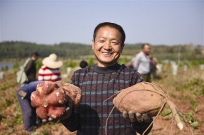 10月12日,南谯区黄泥岗镇张浦郢村村民正在收获红薯。目前,该村7000多亩红薯进入收获季。村里通过红薯经纪人,将当地的优质红薯销往上海、南京等大城市,每亩可以为农户增加3000多元的纯收入,成为农民增收致富的新亮点。