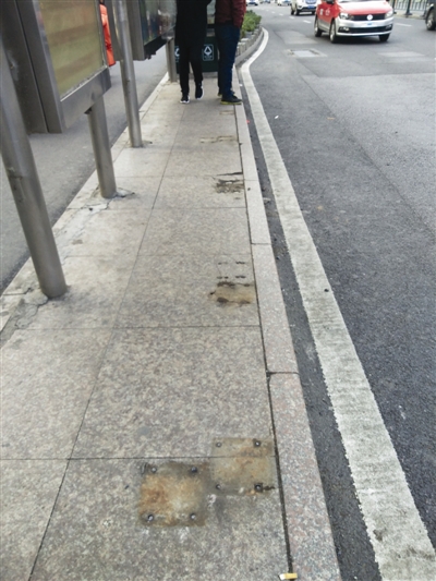 记者看到,约10米长的站台路面上共有8个方形铁块,每个铁块四角处各露出一截凸出路面数毫米的螺栓。“不留心看,还真注意不到,这要是绊上去跌倒了,后果就严重了。”一位乘客担心地说。