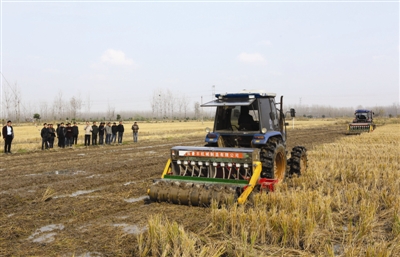 11月14日,滁州市农机专业技术员在全椒县十字镇汊河村举行全市稻茬麦机械化播种技术培训现场会,向与会者讲解稻茬麦机械化播种技术要领。来自全市农机推广、农技推广中心技术人员,稻茬麦种植区域的种粮大户、农机专业合作社负责人及周边农户100多人观摩了稻茬麦机械化播种新技术演示。记者李晓村摄