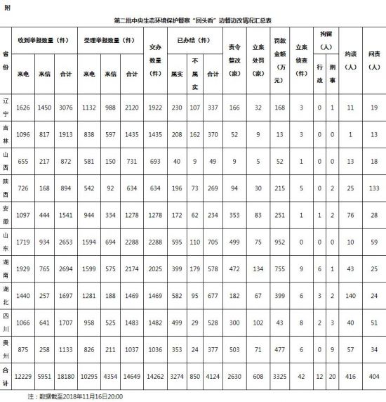 截至11月16日晚,督察组共收到群众举报18180件,经梳理合并重复举报,累计向被督察地区交办转办有效举报14262件。被督察地区已完成查处4124件,其中立案处罚608家,罚款3325万元;立案侦查42件,拘留32人;约谈416人,问责404人。
