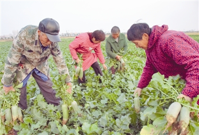 入冬以来,明光市明光街道张湾村呼园的萝卜绿色增产模式攻关试验示范基地,农民在采收萝卜,一筐筐萝卜经分拣整理后埋回土里窖藏,等下霜时再刨出销售。窖藏后的萝卜因为味道好十分俏销,不仅供应当地商超,还大量销往上海、南京等周边城市。目前,该种植基地的500多亩萝卜喜获丰收,预计每亩年产萝卜上万斤,亩均纯收入1万元左右,该基地同时还带动了周边贫困户就近务工增收。特约摄影王绪波