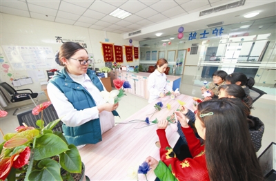 市二院医护人员在教患者们做手工花。记者卢志永摄