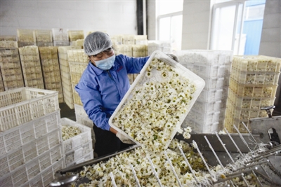 11月21日,滁州市滁菊研究所的生产车间里,职工正加工新鲜滁菊。近年来,该所依托技术、资源优势,加大科技投入,研发出滁菊茶饮、药材、保健等四大系列20多个高附加值产品,带动周边400多户农民种植滁菊2100亩,每亩可为种植户增加纯收入3000多元。特约摄影董 超