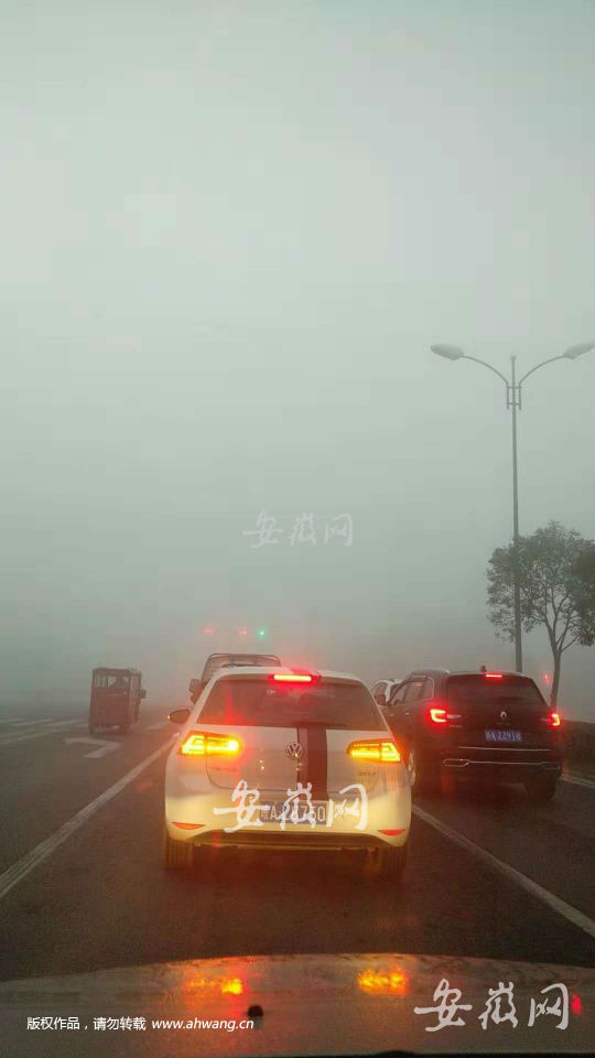 6点40分,合肥市莲花路附近大雾弥漫、能见度很低,车辆打双闪低速通行。