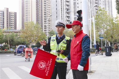 民警和社区志愿者一起,在街头向市民发放宣传单页,在宣传展架前介绍典型事故案例,宣传文明出行理念。同时,民警带领社区“夕阳红文明交通志愿服务队”的志愿者们,分别赶到明光路与西涧路路口、明光路与丰乐路路口,开展文明交通志愿服务。
