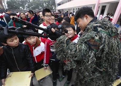 11月30日,在全椒县前进小学,小学生在体验狙击步枪。