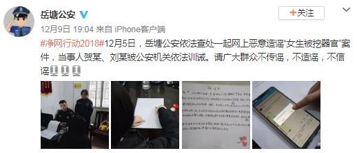 12月5日,湖南省湘潭岳塘公安分局官方微博发布情况通报称,依法查处一起网上恶意造谣“女生被挖器官”案件,当事人贺某、刘某被公安机关依法训诫,警方让其删除网上发布内容并公开了一份其手写悔过书。