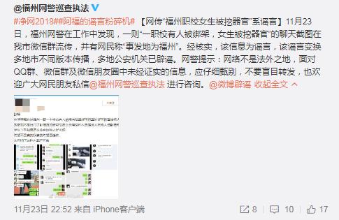 11月23日,福州网警也发布辟谣通报,称网传“福州职校女生被挖器官”系谣言。