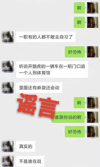 11月23日,广西柳州网警辟谣称,柳州市公安局网络安全保卫支队网警在巡查中发现,一则“一职校有人被绑架,女生被挖器官”的聊天截图在我市微信群流传,有人称“地点系我市官塘一职校,且情况属实”。对于此类涉嫌绑架、挖器官的信息,柳州网警第一时间联系相关部门及属地公安机关进行调查核实,各部门均称未发现此类情况,也未接到相关报警,经判断,网警认为其为谣言信息。